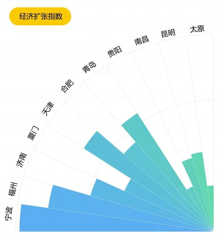 另外,宁波、福州、济南、厦门、天津、合肥、青岛、贵阳、南昌、昆明、太原等中心城市,虽然总体发展水平良好,但从指标得分来看,往往在产业发展状况、公共服务水平、交通、人口结构的某一领域存在短板,部分城市还在省内、同区域内面临着同等量级甚至更发达城市的竞争,因此对周边区域的拉动辐射能力不如扩张型都市圈的中心城市,尚未突破自身行政边界,但一旦补齐短板,其中心城市的发展潜力巨大。
